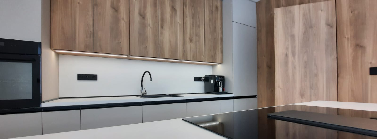Nadčasová kombinace bílého lamina s dřevodekorem jsou doplněny černými spotřebiči a doplňky.