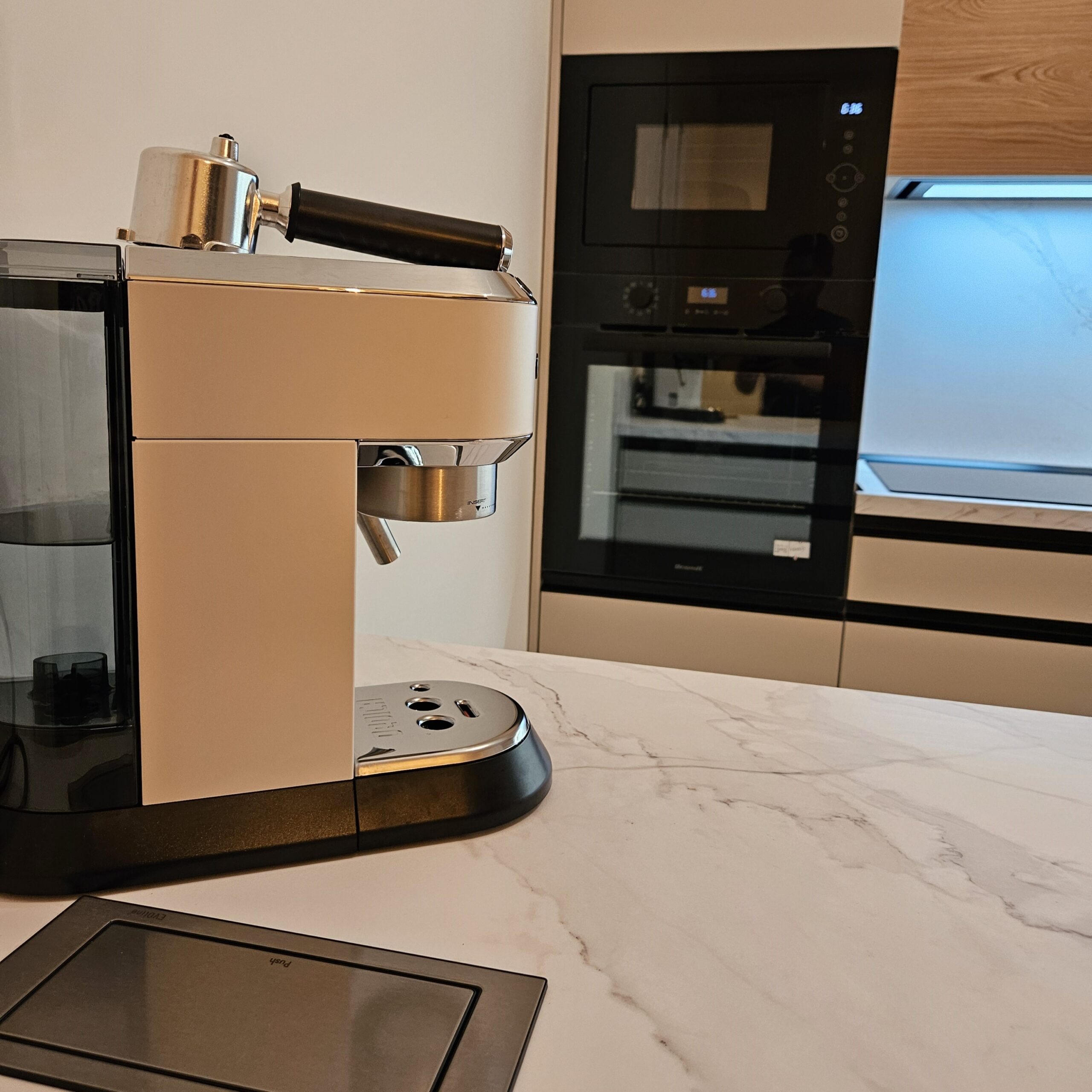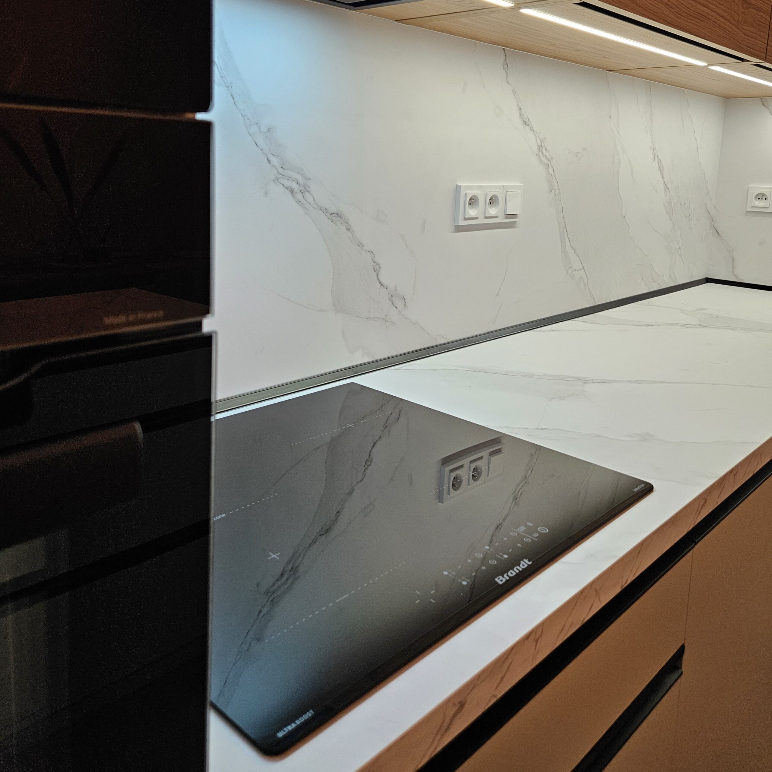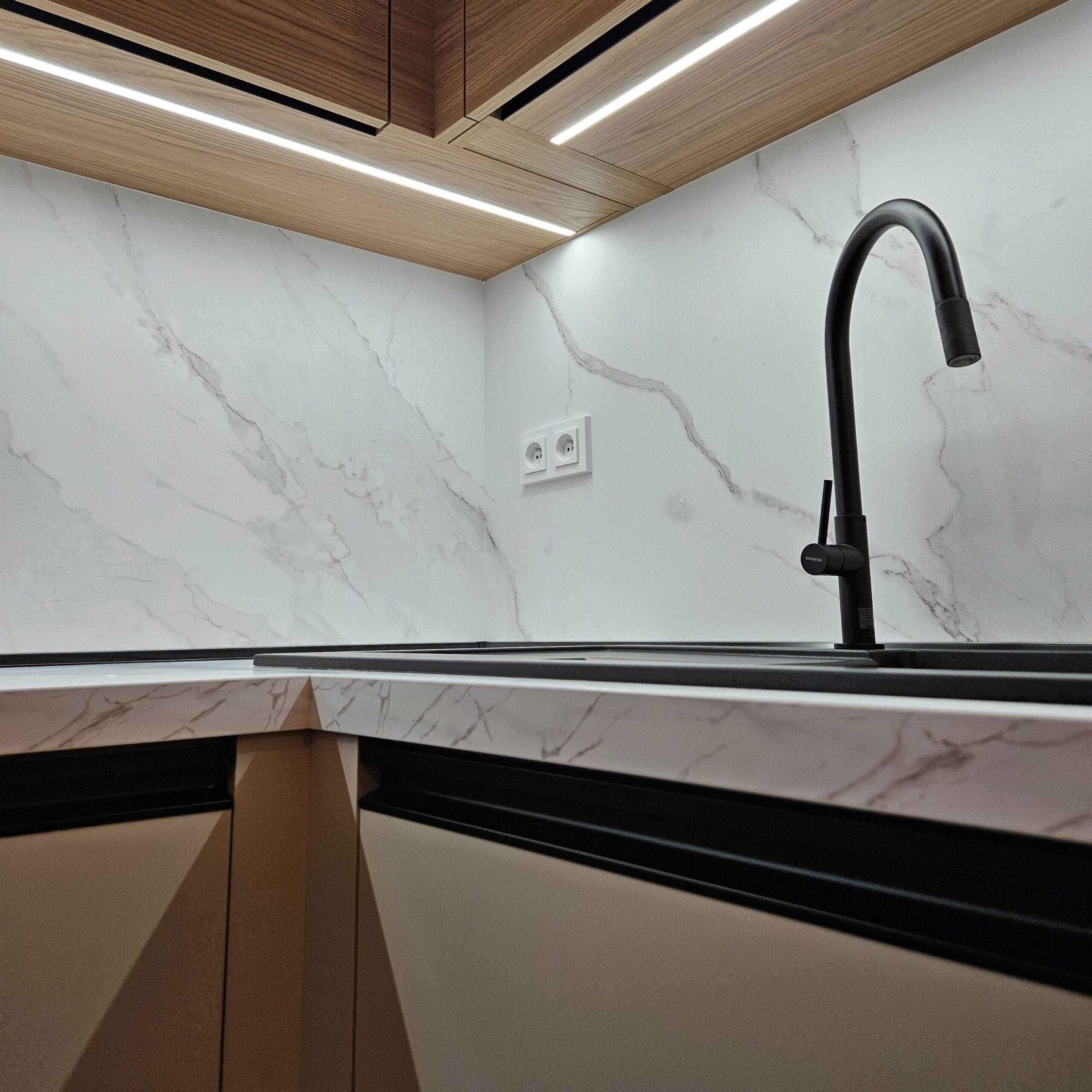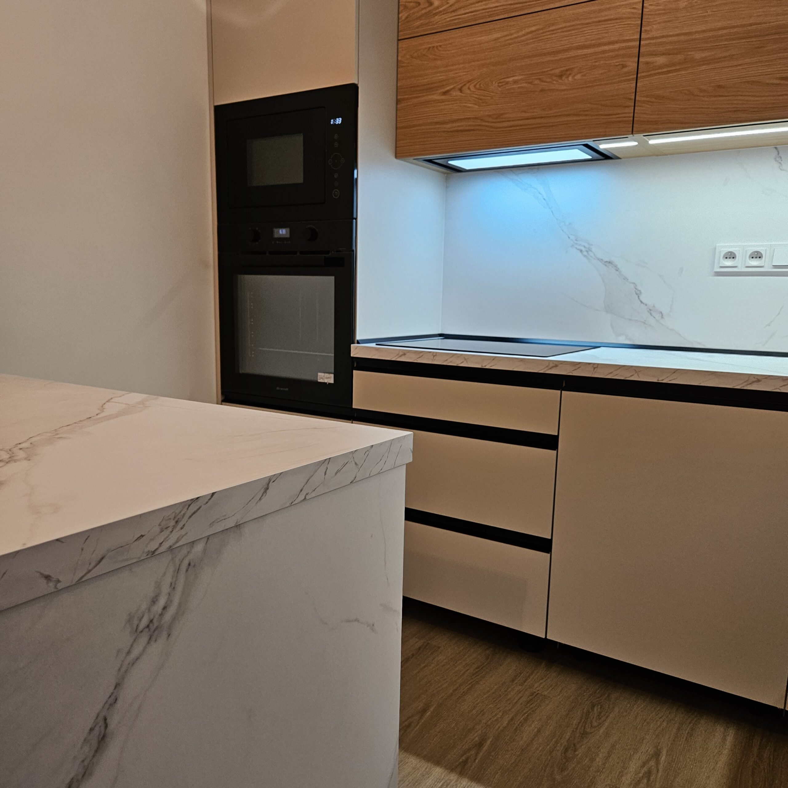 Tato kuchyň na míru propojuje jemný, klidný tón kašmírové šedé s přírodní kresbou dřevodekoru, díky čemuž vzniká prostor, který působí elegantně, útulně a nadčasově. Pracovní deska a obklad v provedení Calacatta, dodávají kuchyni svěží a moderní dojem. Černé zafrézované úchytky dodávají prostoru kontrast a potrhují celkový design kuchyně. Pečlivě sladěné barvy, struktury a detaily tvoří harmonický celek, který spojuje moderní vzhled s praktickým řešením. A samozřejmě osvědčené kování Blum zajišťuje komfort při každodenním používání.