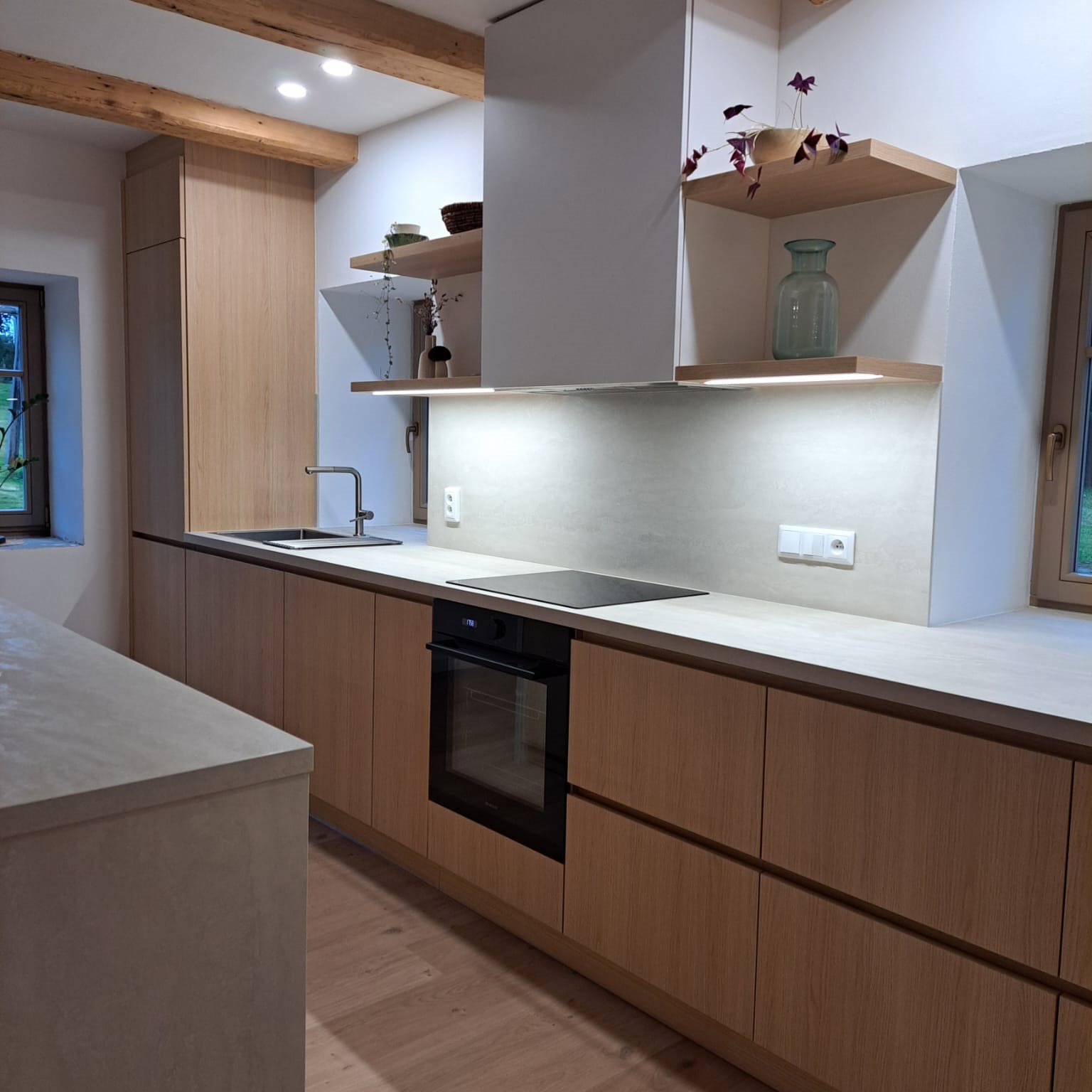 Tato kuchyň na míru nabízí elegantní řešení úchytek, dvířka jsou jemně snížená a prostor za nimi je chytrým způsobem uzpůsoben pro pohodlné a snadné otevírání. Tímto promyšleným řešením vznikla jedinečná kuchyně s čistým, bezúchytkovým designem. Na skříňky byl zvolen dřevodekor Dub Vicenza, který elegantně doplňuje pracovní desku s odstínem Světlá stěrka. Přírodní kombinace barev vytváří harmonický a nadčasový vzhled, který působí útulně a moderně zároveň. Kvalitní kování značky Blum zaručuje dlouhou životnost a pohodlné každodenní používání.