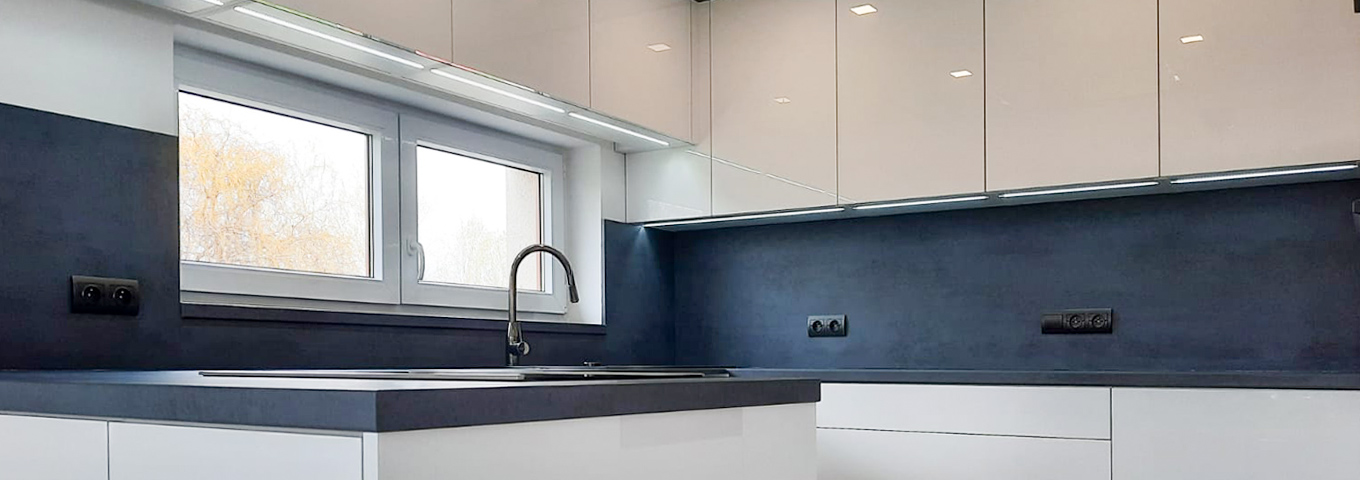Velmi moderní kuchyňská linka vyrobena na míru, které dominuje převážně bílý lesk, který je promítnut na dvířkách a pohledových plochách. Pracovní deska a zadní obklad imitující šedý beton dodává kuchyni eleganci a je v kontrastu s bílým leskem. Naše firma zároveň dodávala luxusní spotřebiče francouzské značky DeDietrich v odstínu Absolute Black. Firma DeDietrich nabízí bezplatnou prodlouženou čtyřletou záruku na všechny výrobky, které jsou určeny pro český trh. Kuchyňskou linku jsme doplnili velmi kvalitním granitovým dřezem německé značky Schock, která patří k evropské špičce. Nadčasový design této kuchyně podtrhuje zvolený bezúchytkový typ otevírání od firmy Blum, který ničím nenarušuje čistý vzhled kuchyně.